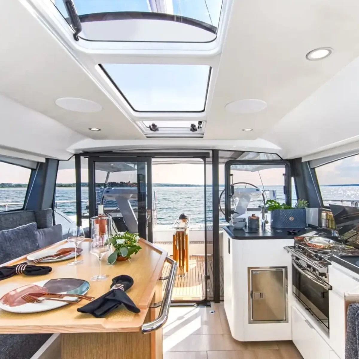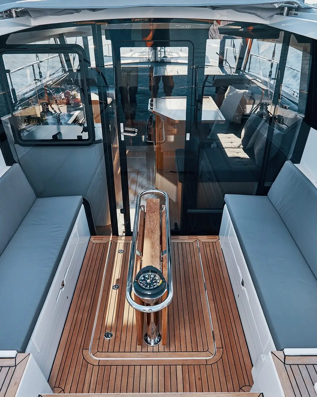DS stands for Deck Saloon, featuring an easy access single-level walkthrough from the cockpit through to the galley and saloon, making the DS41 different to traditional designs that keep saloons and galleys below the main deck.