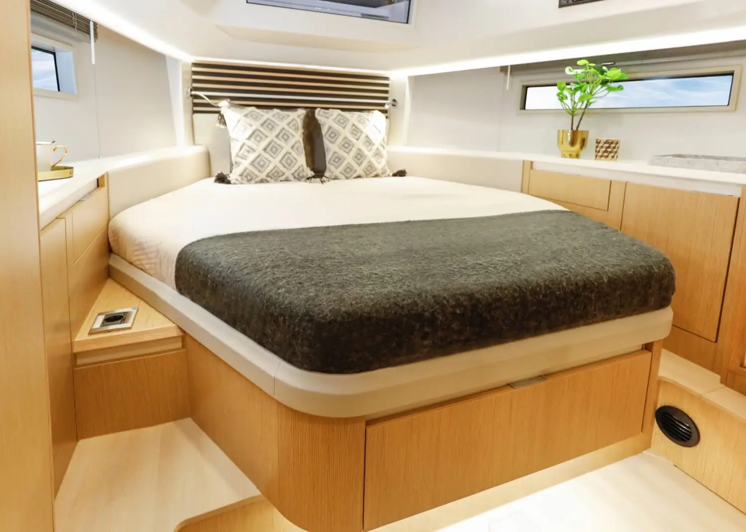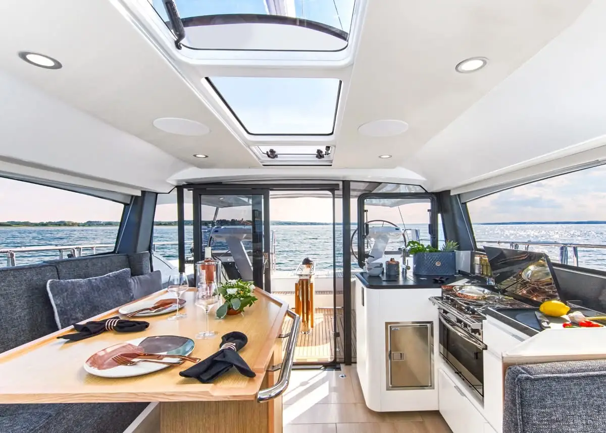 ….with its nearly 14-foot beam and walkaround deck, it’s a wide, accessible platform that’s easy to negotiate. Sliding patio doors open to a spacious cockpit with a retractable sun awning that can be open or shut depending on conditions. As with a cat, those doors, when opened, allow a seamless transition from the saloon to the great outdoors, essentially creating a single-level open floor plan on the main deck. Forward, a sun pad on the foredeck (with an adjustable headrest) converts to a bench seat. It’s hard to believe that this is all happening in a 41-foot footprint.
