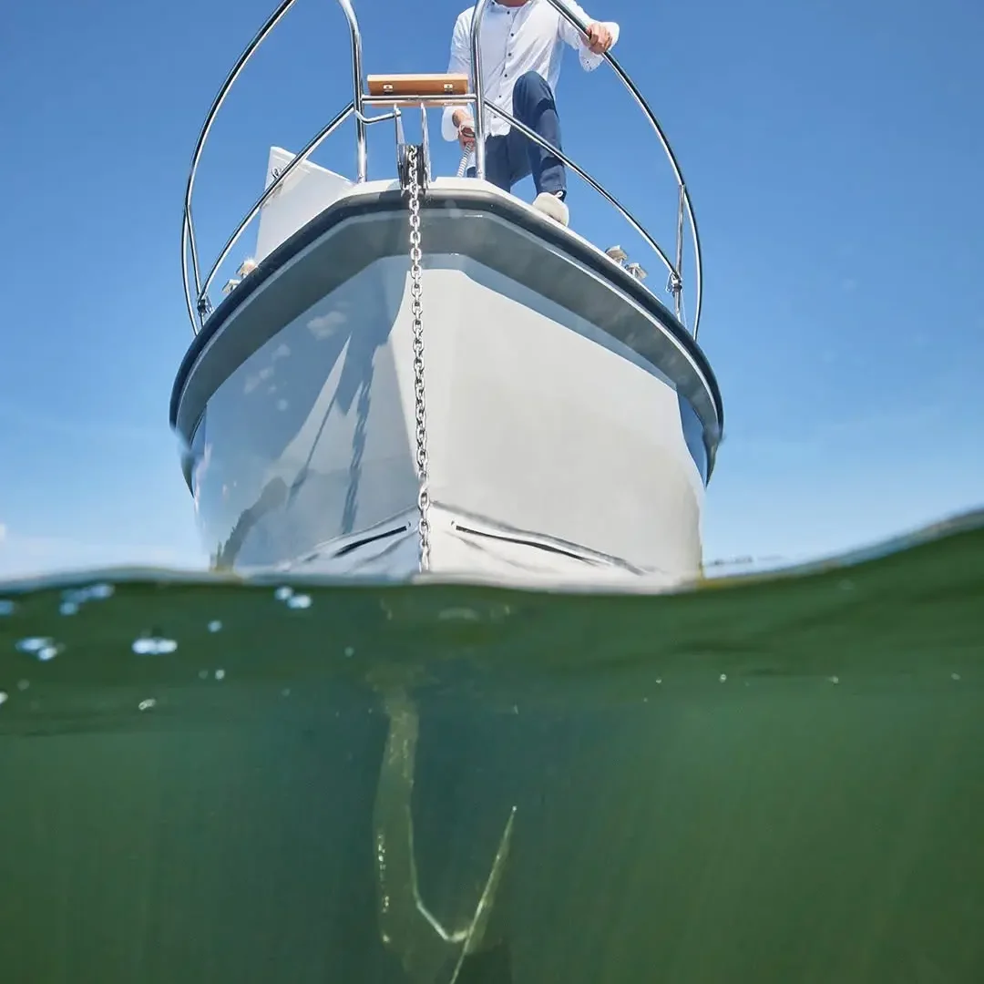 The saloon table with manual high/low leg that converts into a lounging berth, which you can recline on in air-conditioned comfort. When it’s time to cool off, you can shower off on the swim platform before grabbing a chilled drink from the additional fridge openable from the cockpit. Any bounty from the Bay can be prepared on the induction cooktop.