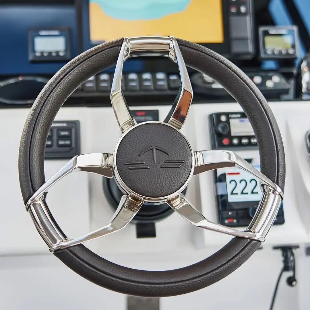 Sandy’s 335v has synthetic teak on the swim platform and extensions around the engines, the cockpit floor, and on the convenient steps to the side decks. Features such as a sliding glass door and a hinged window meld the indoor and outdoor spaces between the cockpit and saloon. Fresh air is assured by the electric sunroof and the driver’s door integrated into the panoramic window on the starboard side, which can combine to make this space virtually open air.