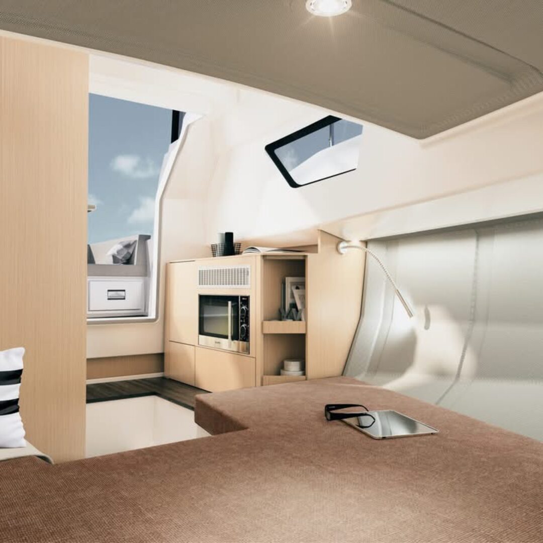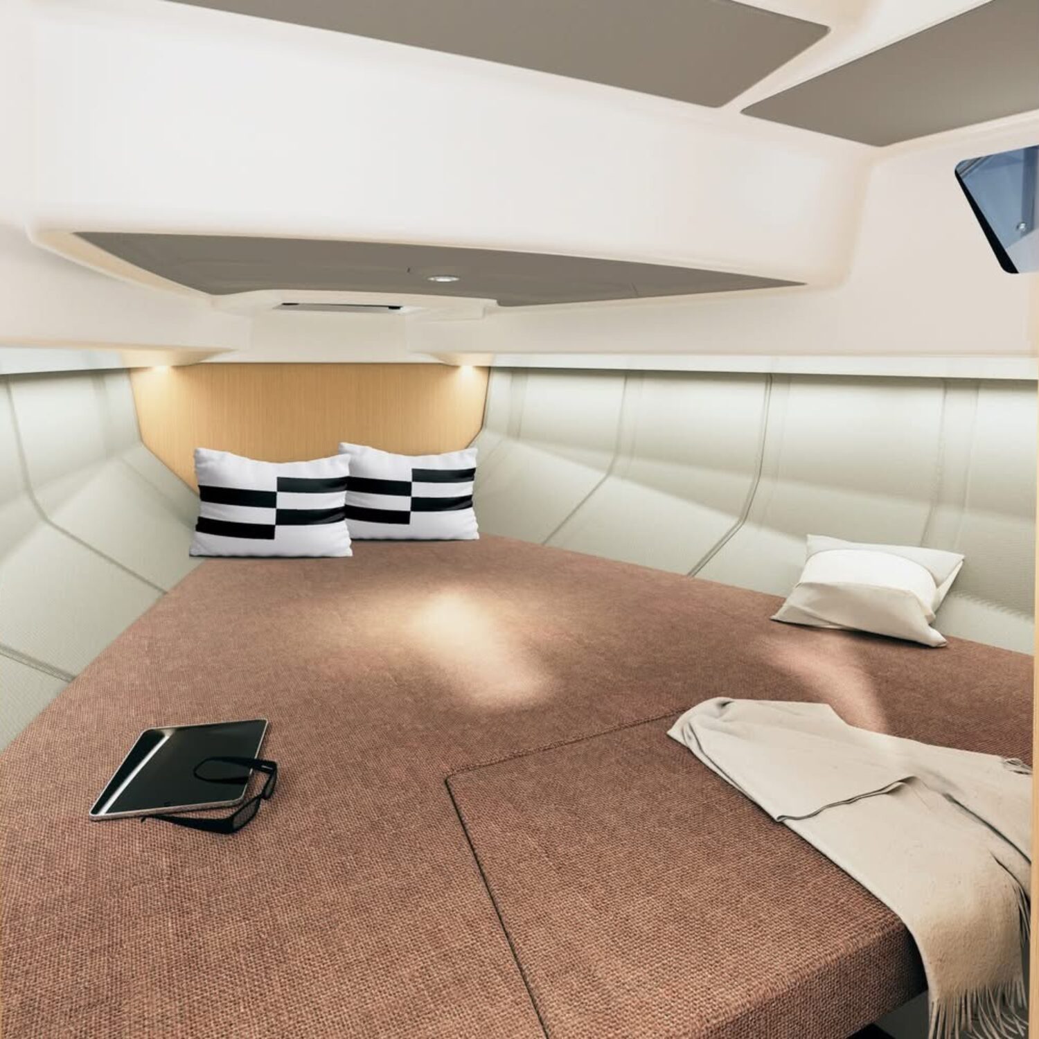 It’s a couple of steps down into the RYCK’s forward cabin through a sliding door, and the interior with its Nordic style wood finishes is stylish and practical. To starboard is the separate toilet with hand basin and storage cupboard. To port of the steps is a galley cabinet for a microwave and up front is a generous vee-berth, with infills to make a queen-sized bed.