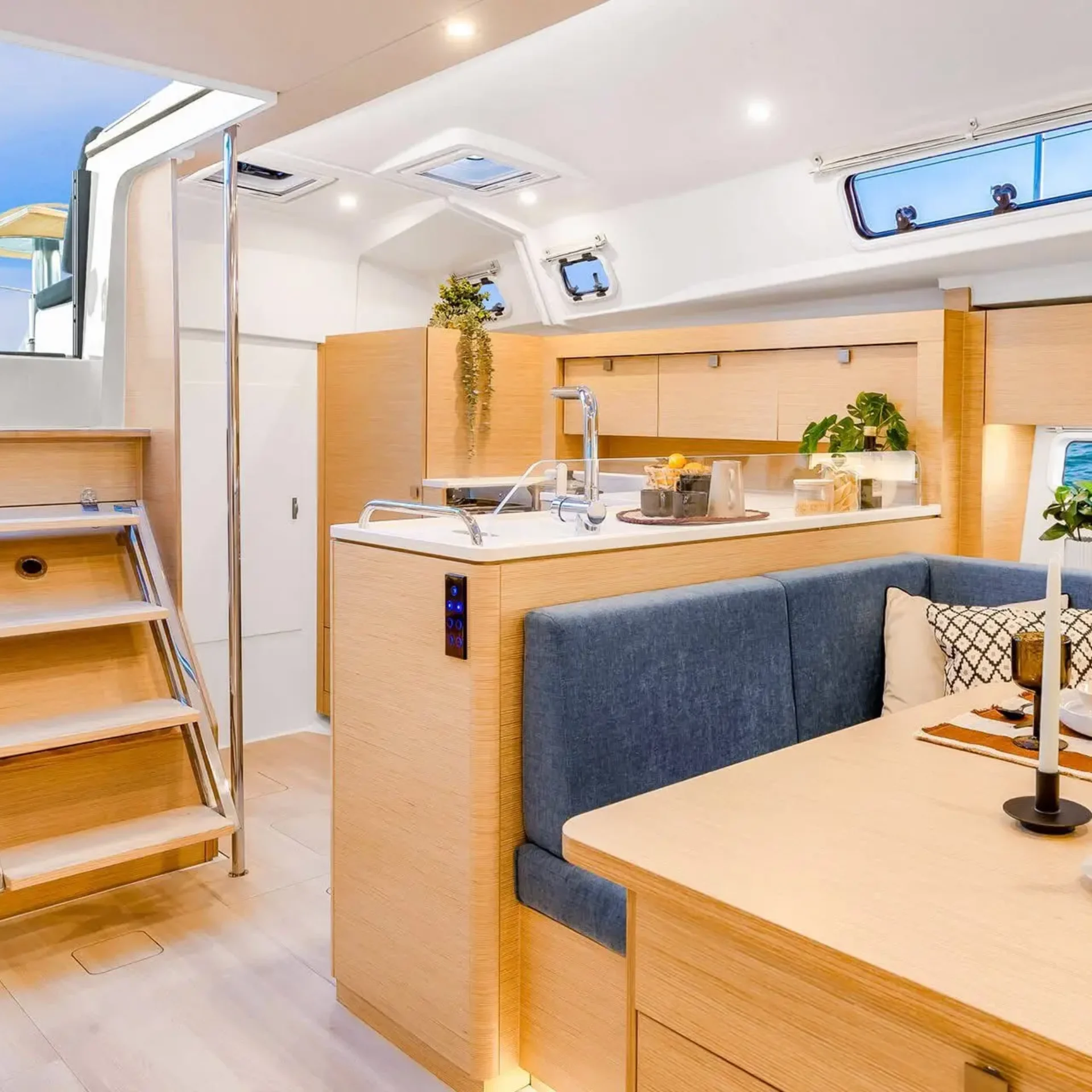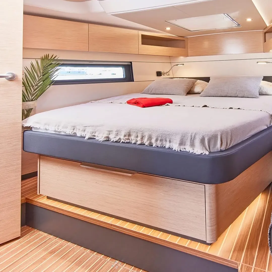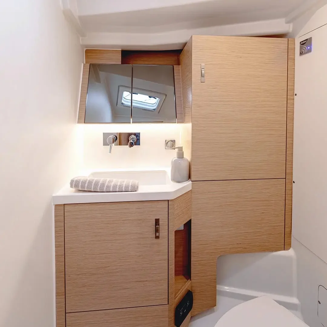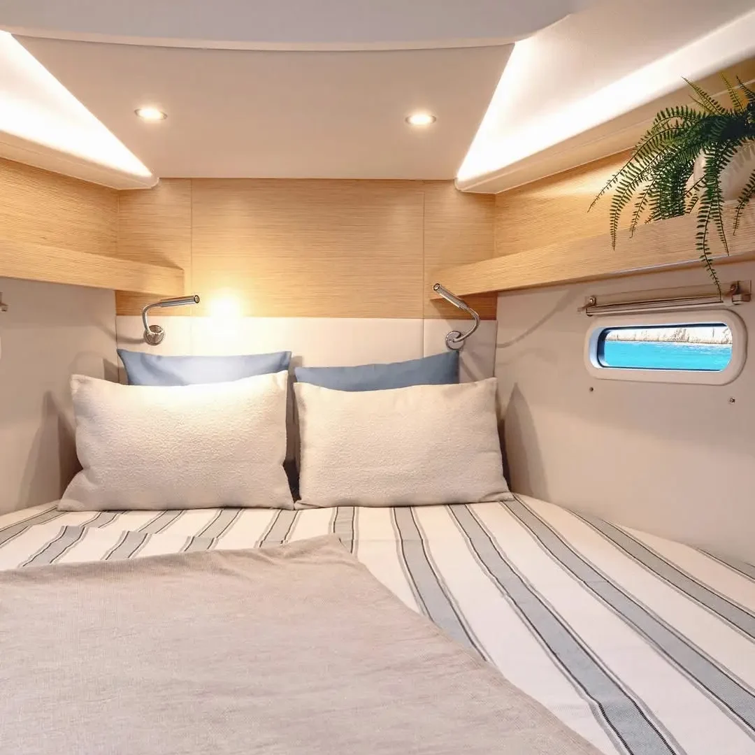 The configuration translates into an extra roomy Owner’s cabin that features a large semi walk-around island bed with enough room for double pillows at the forepeak end, a real rarity in more compact cruisers. There’s also the option for an en-suite bathroom here, another feature normally only found on larger models.