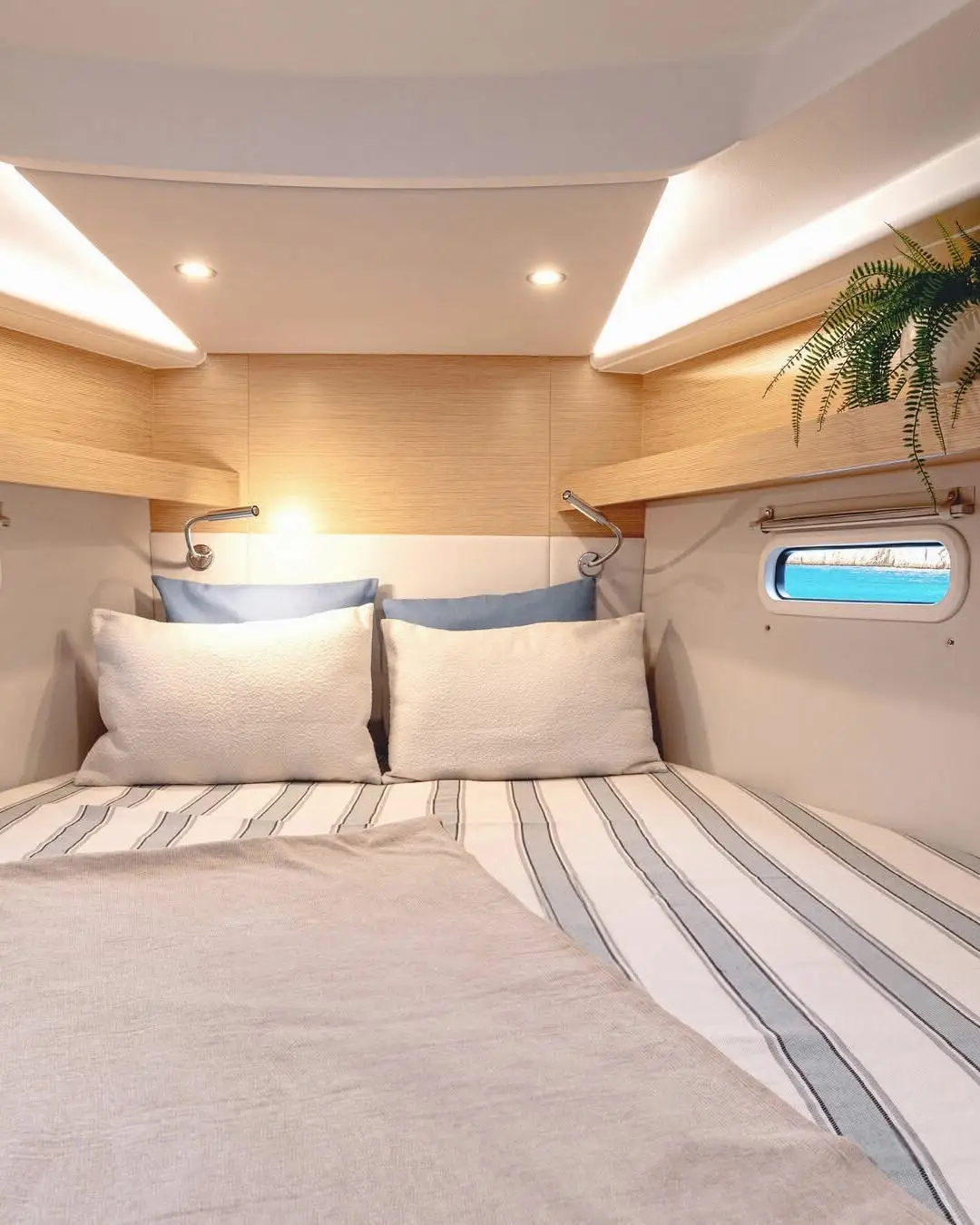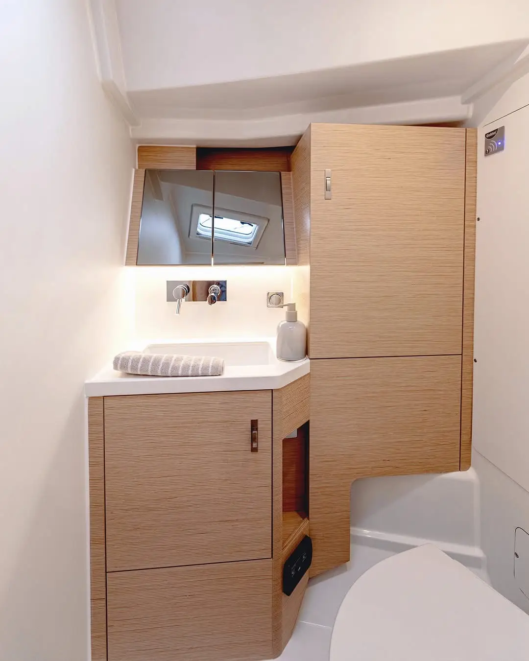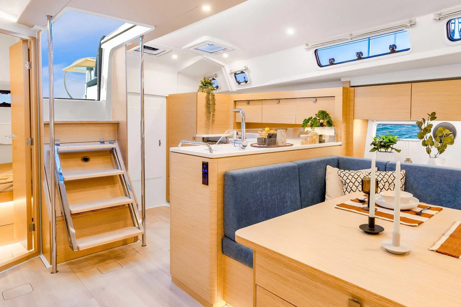 The configuration translates into an extra roomy Owner’s cabin that features a large semi walk-around island bed with enough room for double pillows at the forepeak end, a real rarity in more compact cruisers. There’s also the option for an en-suite bathroom here, another feature normally only found on larger models.