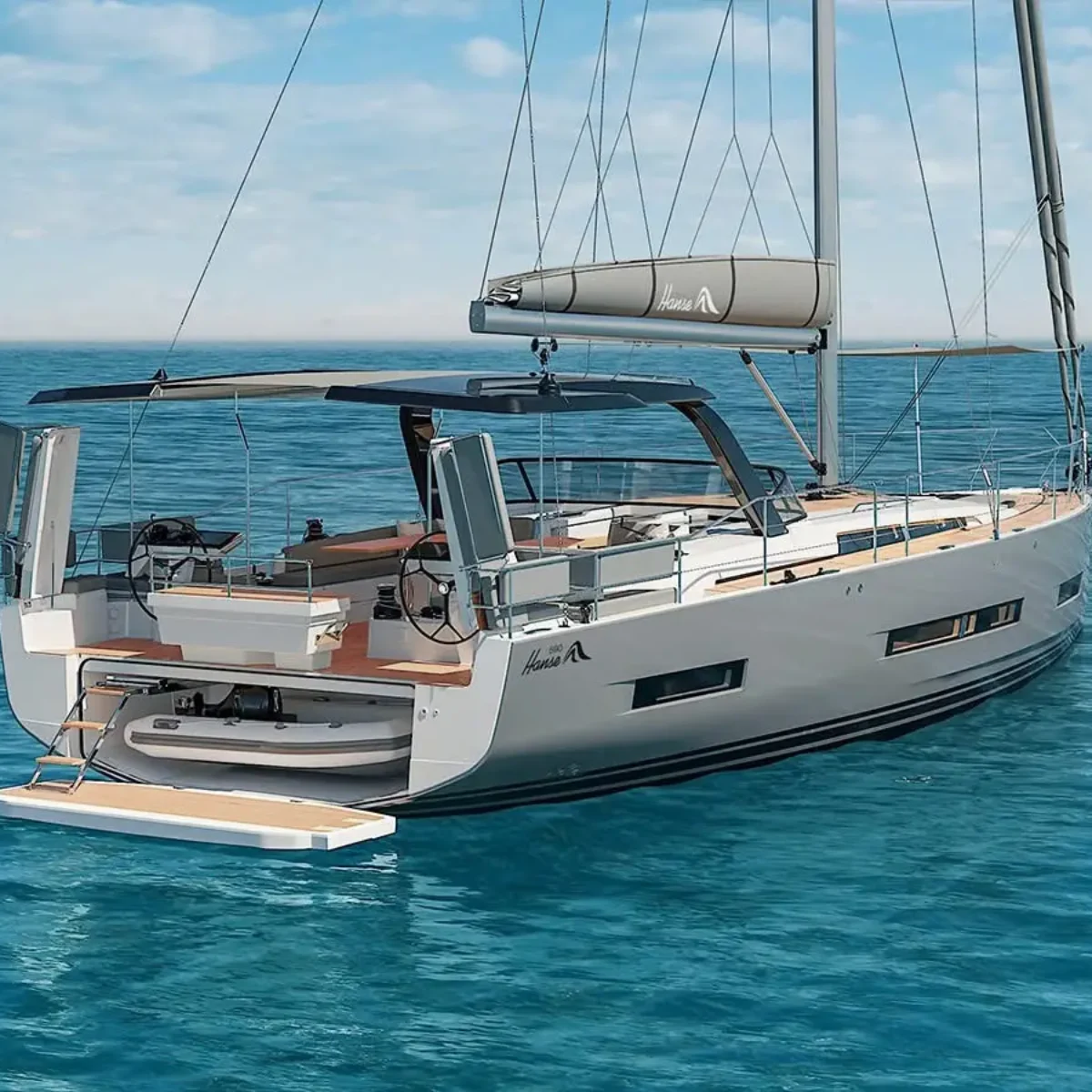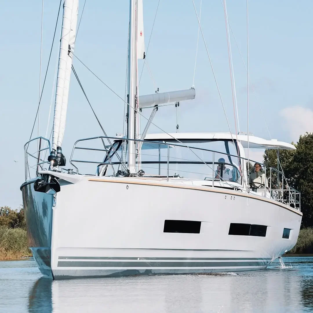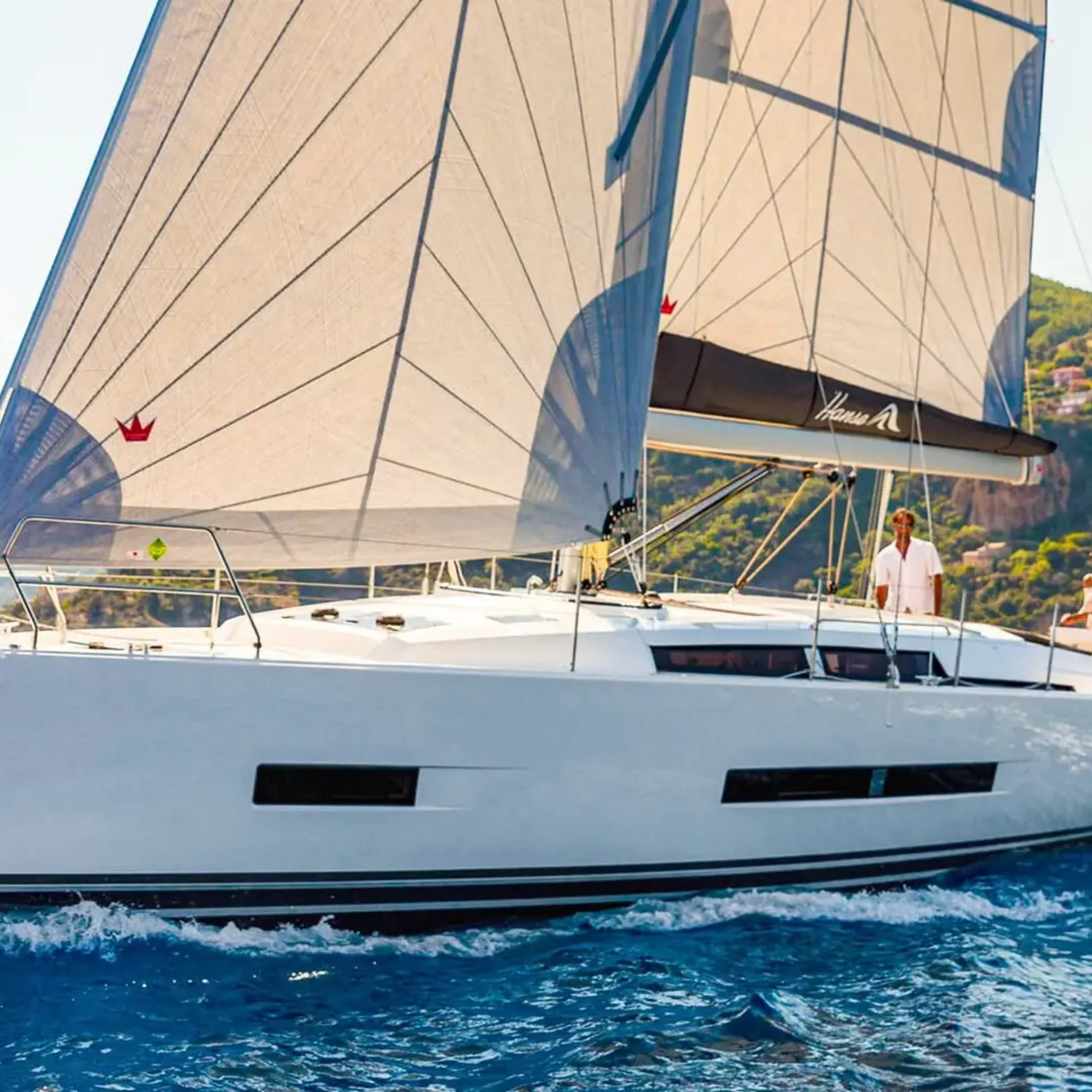Hanse 410 – The Hanse 410 introduces refined aesthetics with a progressive hull design that enhances both performance and handling. Sustainability is at her core – with optional electric propulsion and eco-conscious systems.