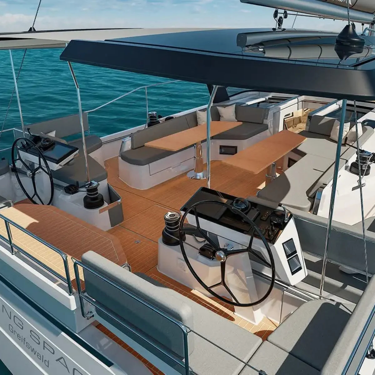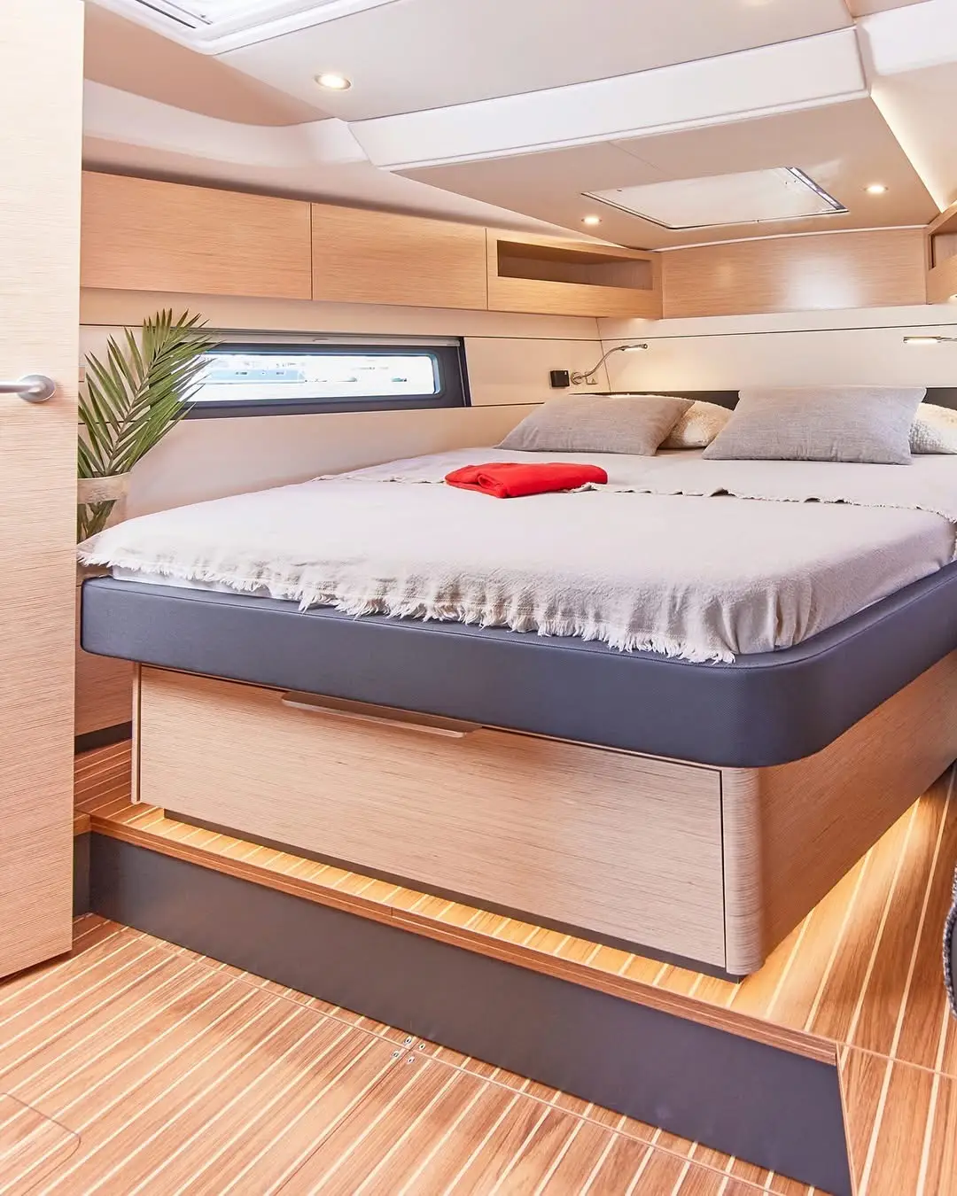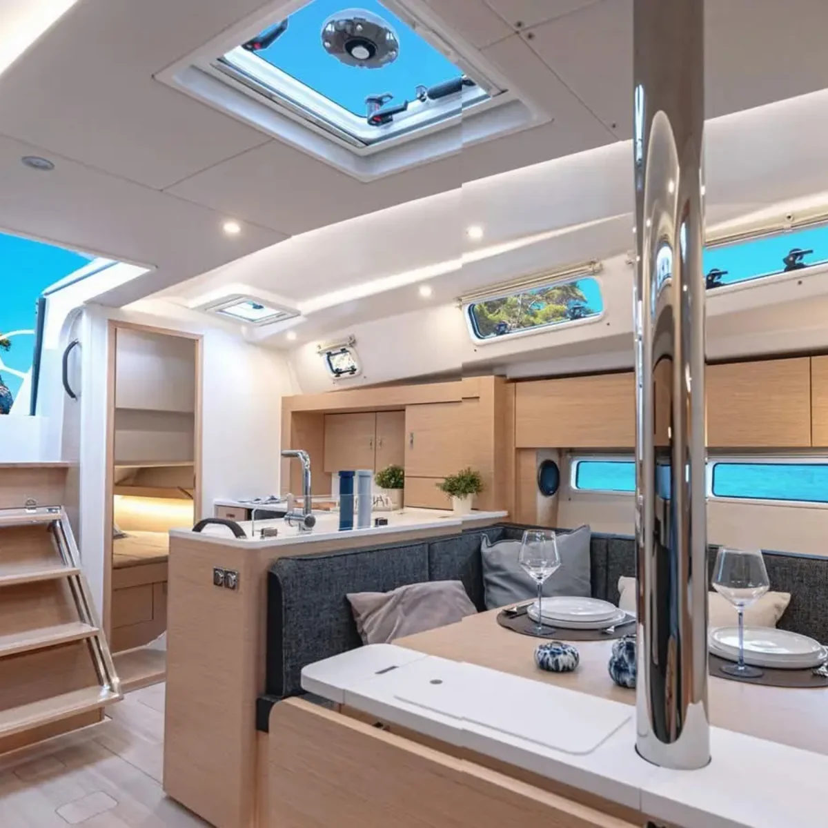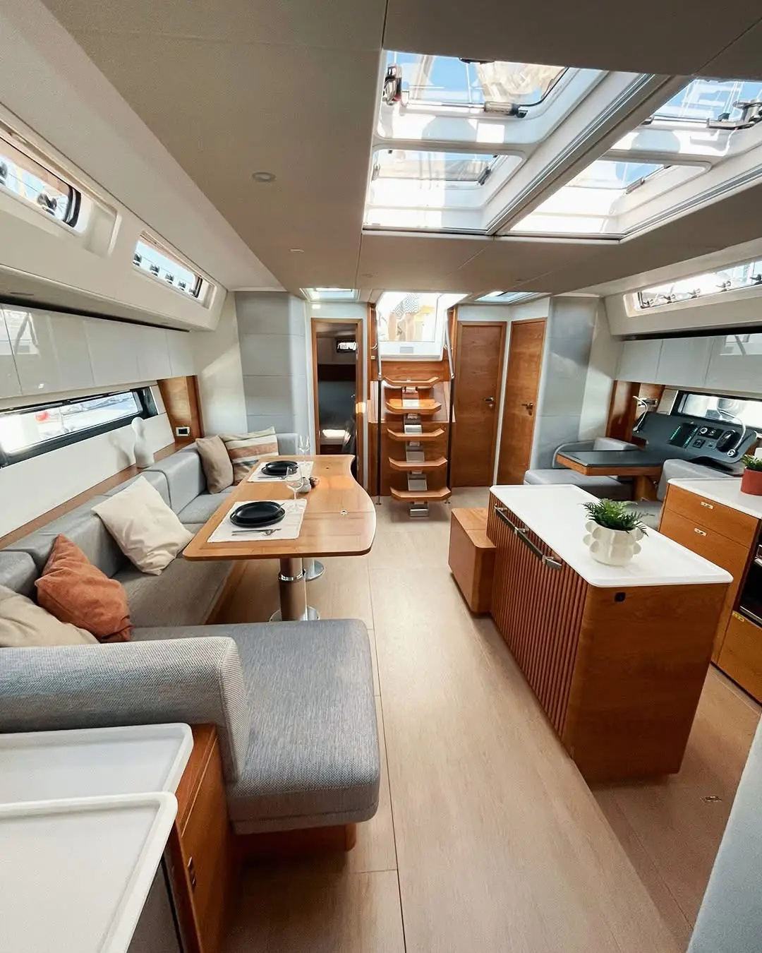 Additionally, the 360’s 3.99 metre beam is carried all the way aft to create a large saloon with a nav table, a large galley with optional extra fridges, and plenty of volume for the aft cabins. The port aft cabin can be a deep sail locker/wet space/storage with access from the cockpit that’s also easily capable of storing a decent-sized deflated dinghy.