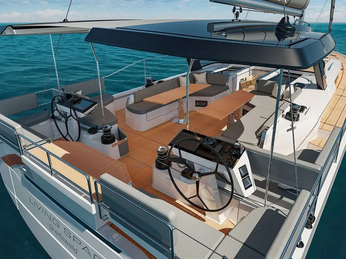 Hanse 590 – At 17.6 metres (57 feet 9 inches), with all the luxury and space you would expect in a flagship, the Hanse 590 blends cutting-edge design with supreme onboard comfort. The 590 possesses the kind of space and appointments that elevate it toward the superyacht ranks. That’s especially evident in the cockpit with a division between sailing areas aft and a huge socialising/relaxing space forward of the twin helms, complete with stylish meridienne seats, large lounges and twin teak tables.