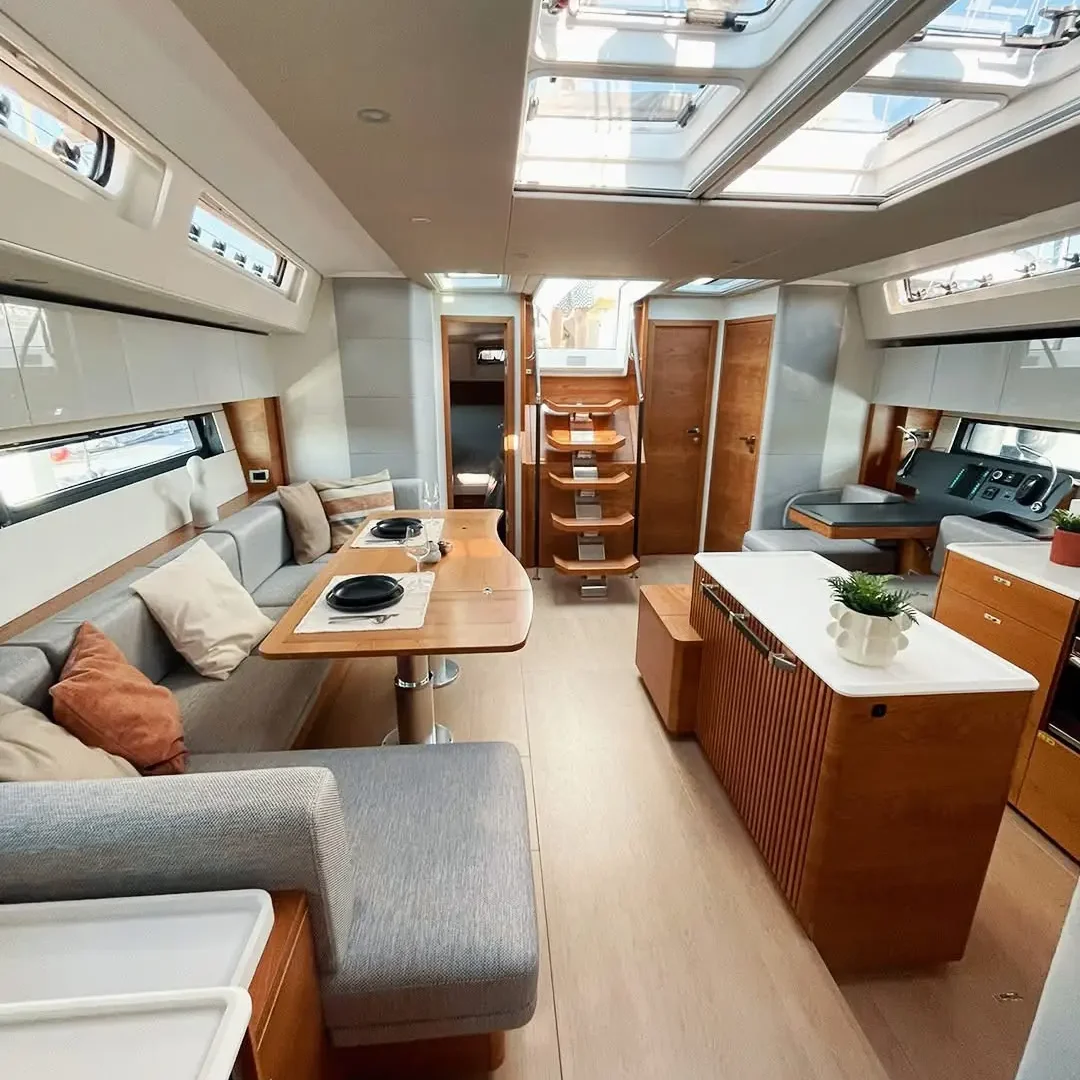 The 410 is available in five different internal layouts. The standard version has a large Owners cabin with an island double berth in the bow, a generous dining area to port in the saloon with a sofa to starboard, a roomy guest cabin aft to starboard, and a big storage locker to port. The L-shaped galley with top and front access to the fridge and soft-close drawers is to port as you come down the companionway, while the head has a separate shower stall.