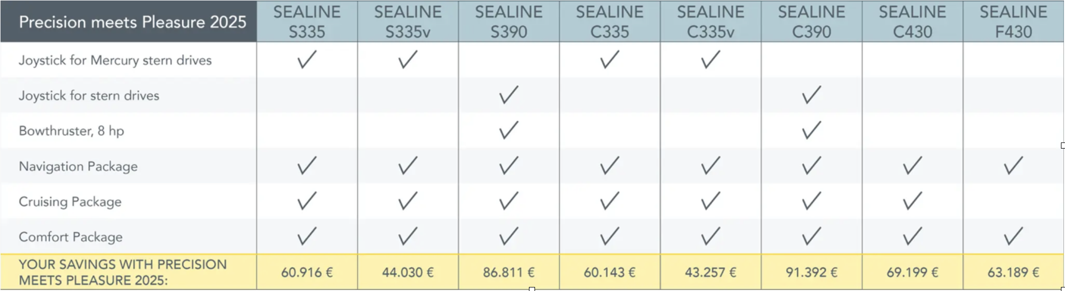 The good news for serious admirers of the Sealine S335, the Sealine C390, and the entire Sealine range is that, thanks to the exclusive Precision meets Pleasure promotion, big savings are available right now if you place an order before 31 October 2025. See the full list of inclusions here: